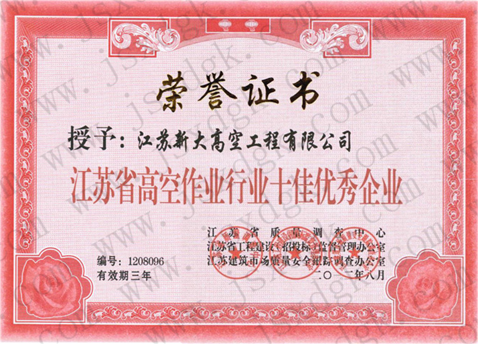 江蘇省高空行業五十強行業證書